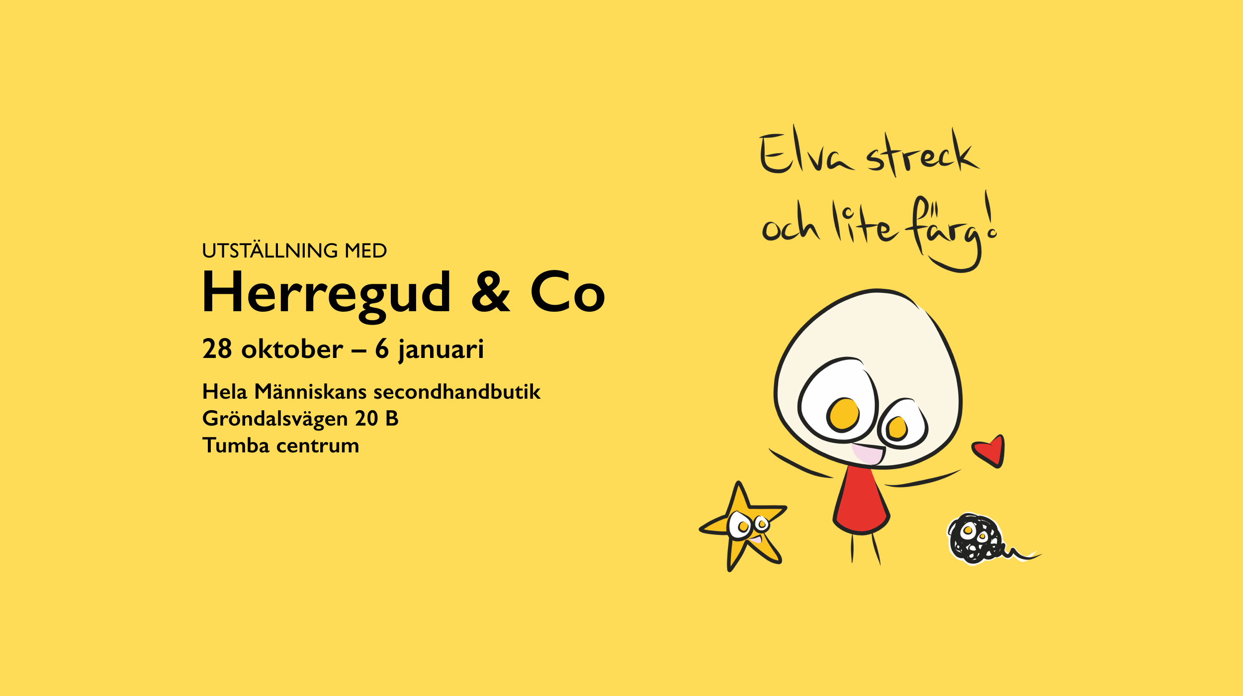 28 oktober– 6 januari visar utställningen “Elva streck och lite färg” under butikens ordinarie öppettider.